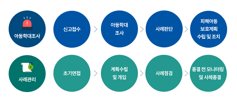 아동학대조사 : 신고접수 > 아동학대조사 > 사례판단 > 피해아동 보호계획 수립 및 조치