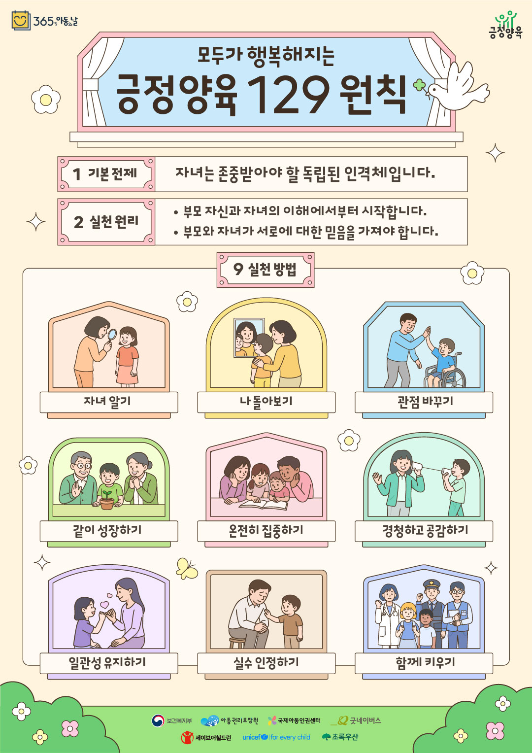긍정 양육은 아동을 독립된 인격체로 존중하며 부모와 자녀 간 상호 소통과 이해, 신뢰를 바탕으로 한 양육 방법입니다아동을 존중하는 긍정 양육문화 확산을 위해 보건복지부, 아동권리 보장원,국제아동인권센터, 굿네이버스,세이브더칠드런,유니세프한국위원회,초록우산어린이재단이 함께 '긍정약율 129원칙'을 마련하였습니다(양육 정보 상담을 제공하는 보건복지 상담센터 번호 '129')