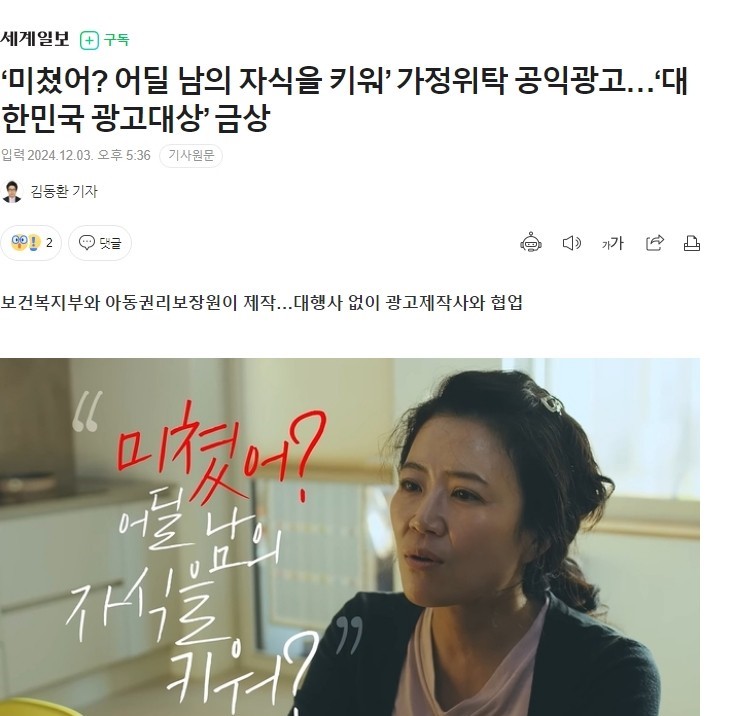 가정위탁 공익광고, '대한민국 광고대상' 금상