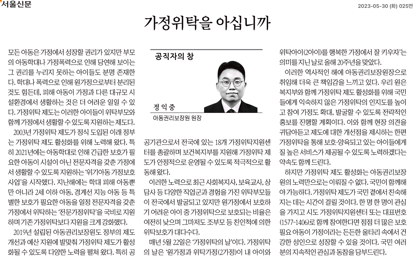 [기고] 가정위탁을 아십니까 / 정익중 아동권리보장원 원장
