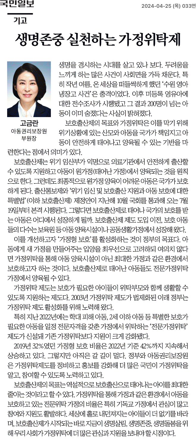 [기고] 생명존중 실천하는 가정위탁제 / 고금란 아동권리보장원 부원장